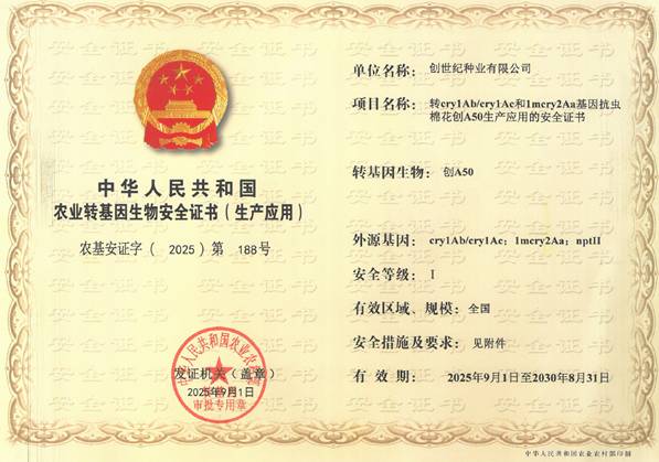 短讯:我司创A50新型抗虫棉技术获批生产应用安全证书