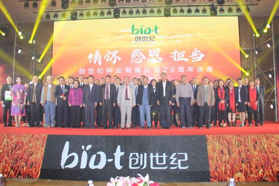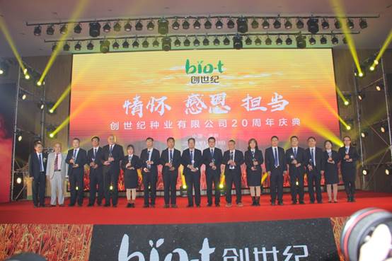论坛会结束后,公司举办了以“情怀、感恩、担当”为主题的颁奖晚会,一曲开场舞拉开了“一路有你 砥砺前行”感恩晚会的序幕。晚会以董事长至未来的一封信,讲述董事长吴开松先生“我是农民的儿子,为农民做点事是我最大的心愿”的伟大情怀。杨雅生总裁围绕创世纪二十年来的突出成就及为发展规划做了精彩的致辞。二十年来,通过创世纪人的艰苦创业取得的突出成就:公司业务不断拓展为从事植物生物技术研究、棉花、玉米、水稻、小麦、油菜等五大农作物新品种选育繁育、生产加工、营销服务和农作物、蔬菜、花卉等种子(种苗)进出口业务;公司高度重视科研育种工作,构建了生物技术中心+种质创新中心+粮棉油作物育种中心“三位一体”的现代高效商业化生物育种体系。已获得国家发明专利40项,已申请抗虫基因、耐旱、耐盐基因、抗除草剂基因等发明专利数十项和PCT百余项;公司及参控股公司自主及合作选育审定(登记)了34个棉花、玉米、水稻、油菜新品种;植物抗耐逆研究技术、寒地杂交粳稻技术、超级稻育种技术、三系杂交小麦技术等均处于国际领先或先进水平;公司已在全国不同生态区建成规范和稳定的制(繁)种基地;建成河南温县、新疆库尔勒、阿克苏、湖南长沙等4个现代化的种子加工厂,在湖北、安徽、河北、南疆、北疆、黑龙江、河南、湖南等五大作物主产区分别建立了大区营销中心,营销网点近千个;公司先后斥巨资建设了库尔勒创世纪加工厂、汇隆棉业公司加工厂、温县加工厂、龙岗、大鹏和海南生物园、各生态区域玉米水稻棉花等育种站及今天正式搬入的创世纪种业大厦等基建项目;为科研、育种、生产、加工和办公提供了强有力的保证;公司先后被评为“国家级高新技术企业”、“中国种业信用骨干企业”、“中国种业信用评级AAA级信用企业”、“广东省农业龙头企业”、“广东省育繁推一体化种业骨干企业”;公司“抗虫棉产业化项目”被国家发改委评为“国家级高新技术产业示范工程”;与山东棉花研究中心合作的“高产稳产棉花品种鲁棉研28号选育与应用”项目被评为“国家科技进步奖二等奖”。