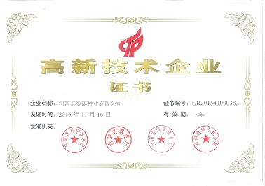 河南丰德康种业有限公司自2009年成立以来,一直致力于高新技术产品的自主研发工作,先后培育出“丰德存麦1号”、“丰德存麦5号”、“存麦8号”、“存麦11”等优良小麦新品种,并获得发明专利1项。公司于2015年按照《高新技术企业认定管理办法》和《河南省高新技术企业认定管理实施细则》等有关规定,组织申报高新技术企业认定工作。经全国高新技术企业认定管理工作领导小组办公室批复,2016年2月23日公告,河南丰德康种业有限公司首次被认定为“高新技术企业”。 3月3日公司顺利取得由河南省科学技术厅、财政厅、国家税务局、地方税务局联合颁发的高新技术企业证书。