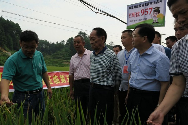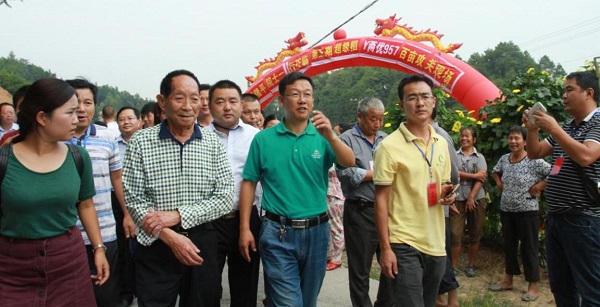 2016年9月6日上午,袁创公司位于湖南省隆回县羊古坳乡牛形村的Y两优957百亩攻关基地迎来了袁隆平院士、省农委副主任黄其萍、湖南农业大学党委书记周清明、省农委钟子处处长许靖波、湖南杂交水稻中心主任齐绍武以及参加湖南省超级杂交稻“种三产四”丰产工程中稻现场会议的各级领导、专家、各市级农业主管部门、种业企业和湖南卫视、科技日报、湖南日报等多家媒体共计300余人的现场检阅。