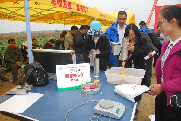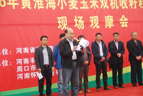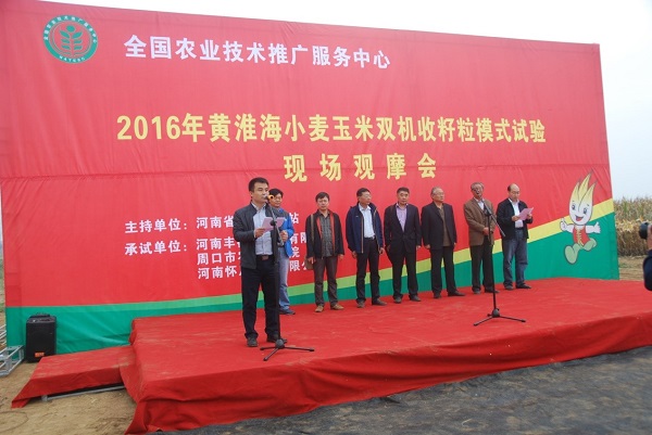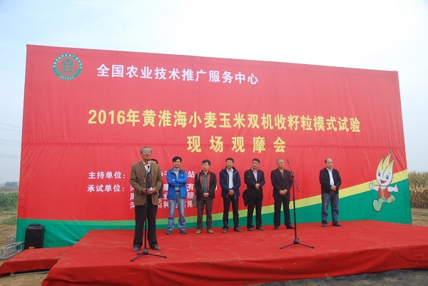 10月10日,由全国农业技术推广中心主办、河南省种子管理站承办的2016年黄淮海小麦玉米双机收籽粒模式试验现场观摩会在河南省郑州市隆重召开。全国农业技术推广服务中心品种区试处邱军副处长、河南省种子管理站周继泽副站长、陕西省种子管理站站长、国家玉米评审委员严勇敢、北京农林科学院玉米研究中心主任、国家玉米专家指导组组长、国家玉米评审委员赵久然研究员、河北省种子管理站副站长、国家黄淮海夏玉米区试主持人周进宝、河南丰德康种业有限公司董事长郑天存研究员、河南农业大学李潮海教授、国家农作物品种审定委员会玉米专委会、国家黄淮海夏玉米品种试验主持单位代表及河南、河北、山西、江苏、安徽、山东、陕西省种子站、有关育种专家、特邀企业代表和相关媒体等共150人在河南省荥阳市参加了本届会议。