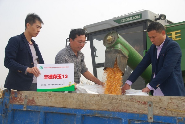 参加此次黄淮海小麦玉米双机收籽粒模式试验的小麦品种是丰德存麦21,玉米品种是丰德存玉10号、东方红119、强硕168、豫单9953、丰德存玉13号、新单58、新单68、怀川39、晟玉88、迪卡517、先玉1458,经专家现场测产,其中丰德存玉10号以产量第一、果穗脱落数最少、籽粒破碎率最少的成绩博得专家的一致好评!