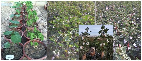 图中分别为抗逆棉在温室和田间的抗逆表现与对照对比情况